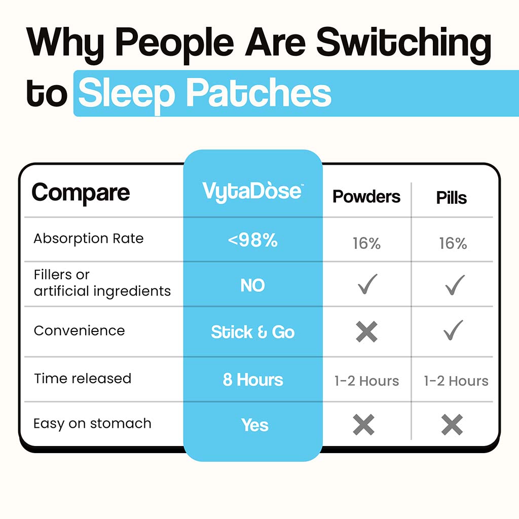 Instead of sudden spikes like pills or powders, the patch works gradually—supporting natural sleep rhythms and helping you stay asleep longer.