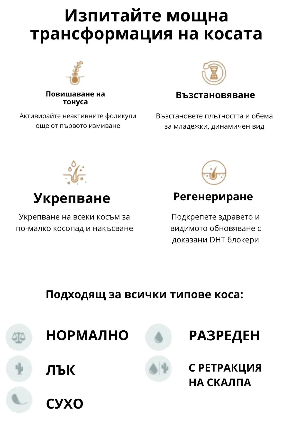 Лесна 90-дневна рутина (2–4 пъти седмично), която помага в борбата с локалния DHT, подобрява микроциркулацията и придава на косата по-гъст вид. Резултатите варират.