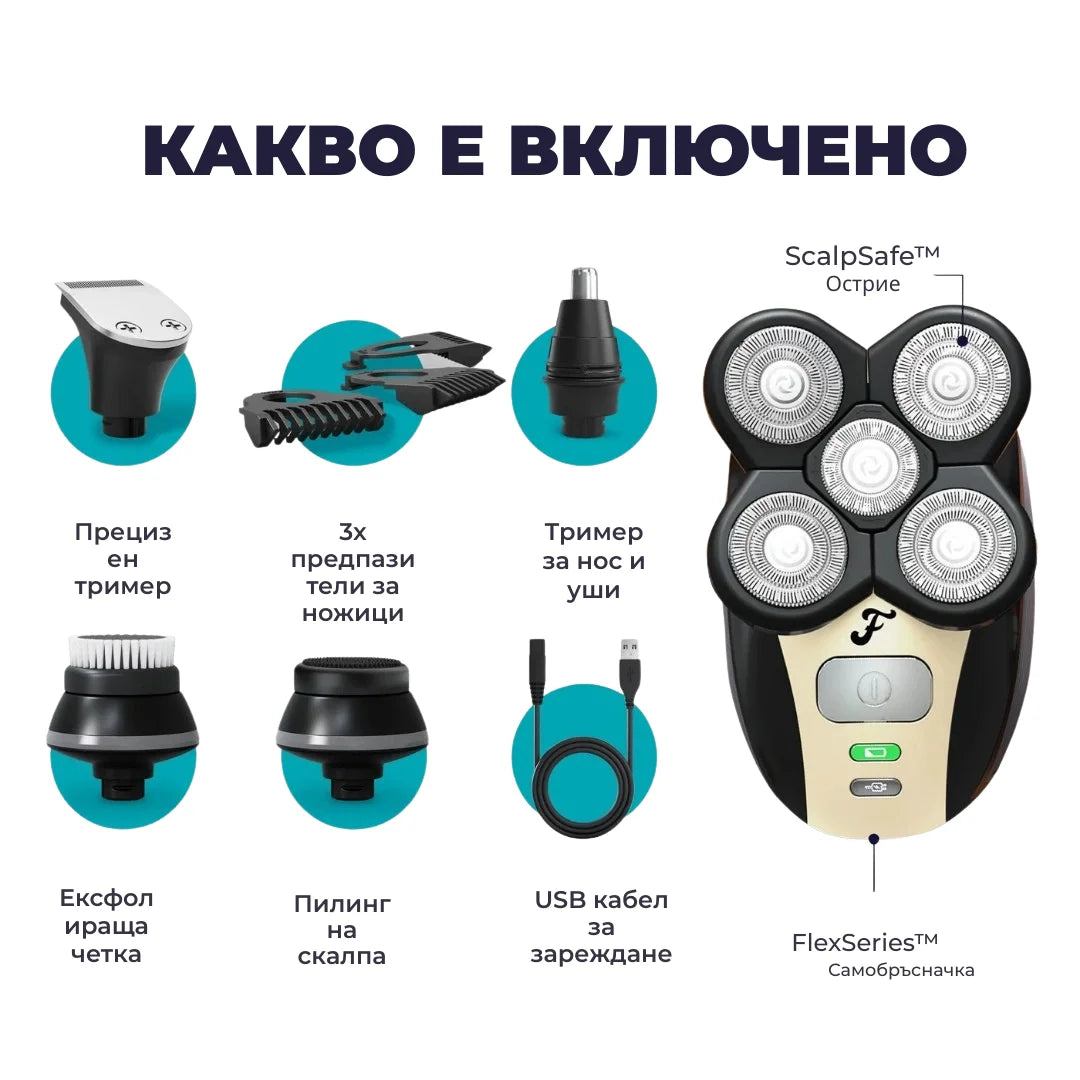 Включва тример с приставки, тример за нос и уши, четка за ексфолиране и четка за почистване на скалпа — всичко, от което имаш нужда за цялостна грижа.