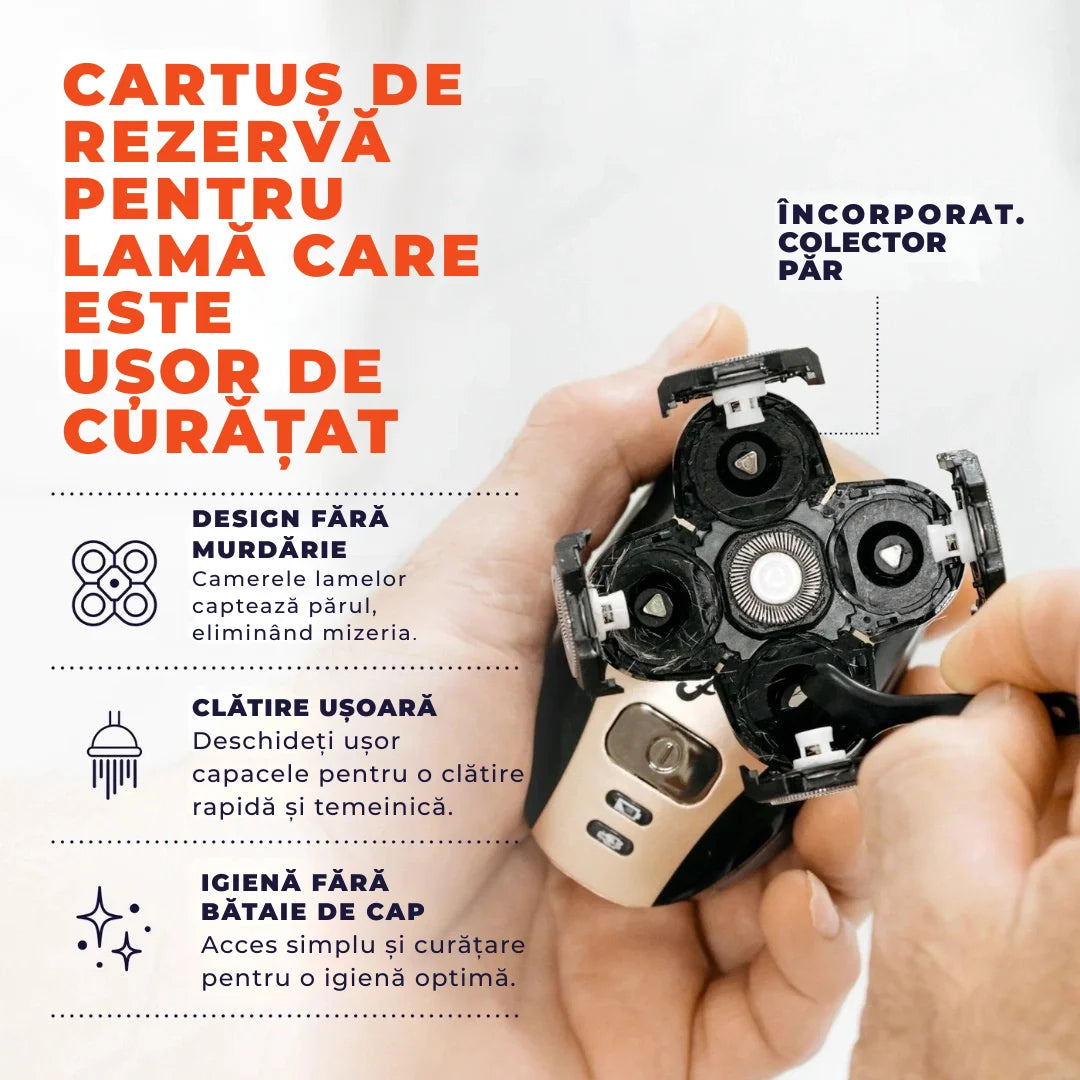 Da, aparatul nostru electric rotativ este conceput să funcționeze eficient pe toate tipurile de păr — inclusiv des și creț. Dispune de mai multe lame care lucrează împreună pentru a tunde rapid și eficient firele de păr, făcându-l ideal pentru toate nevoile de bărbierit. Capul rotativ urmărește curburile capului și permite un bărbierit fin chiar și în zonele greu accesibile.