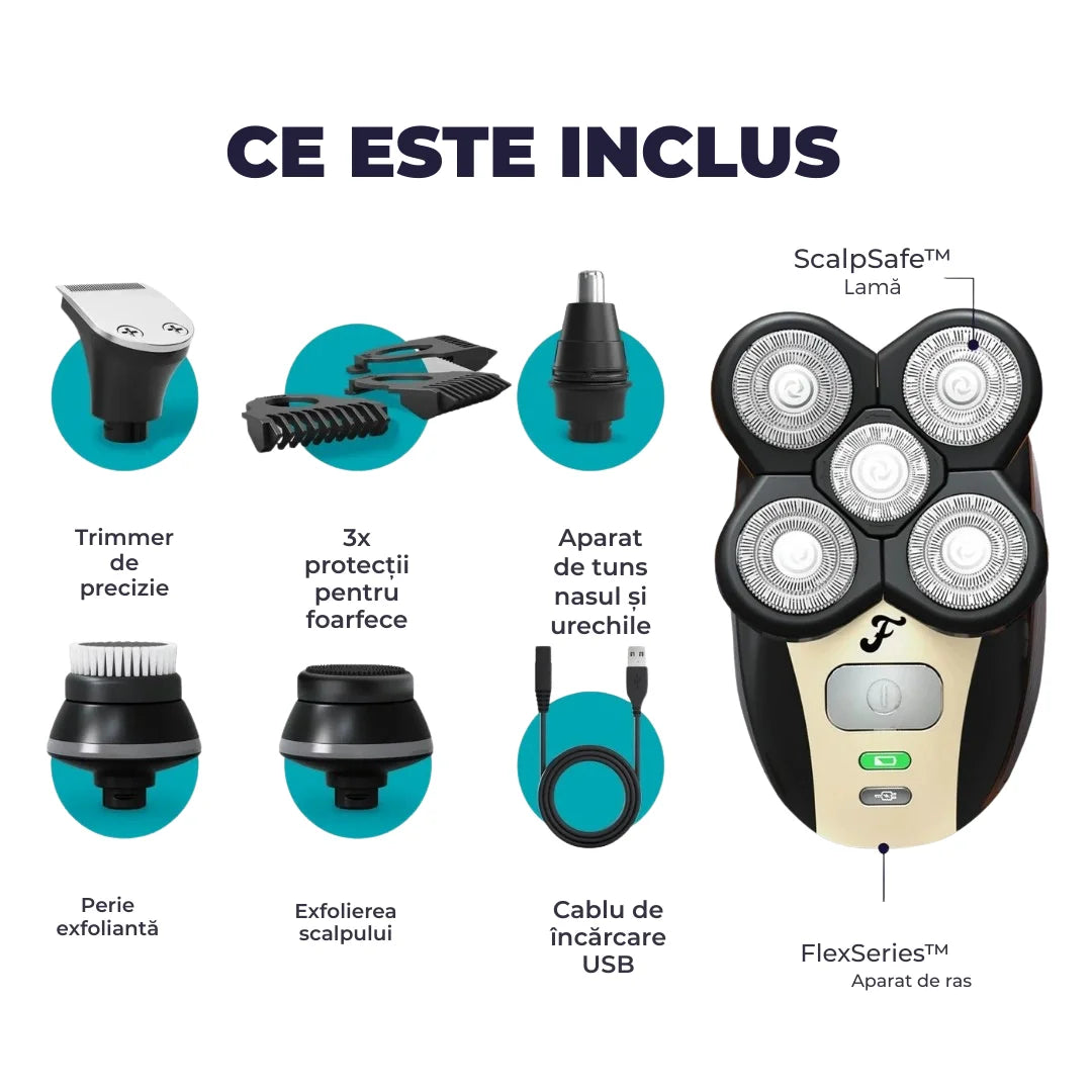 Include trimmer cu accesorii, trimmer pentru nas și urechi, perie pentru exfoliere și perie pentru curățarea scalpului — tot ce ai nevoie pentru o îngrijire completă.